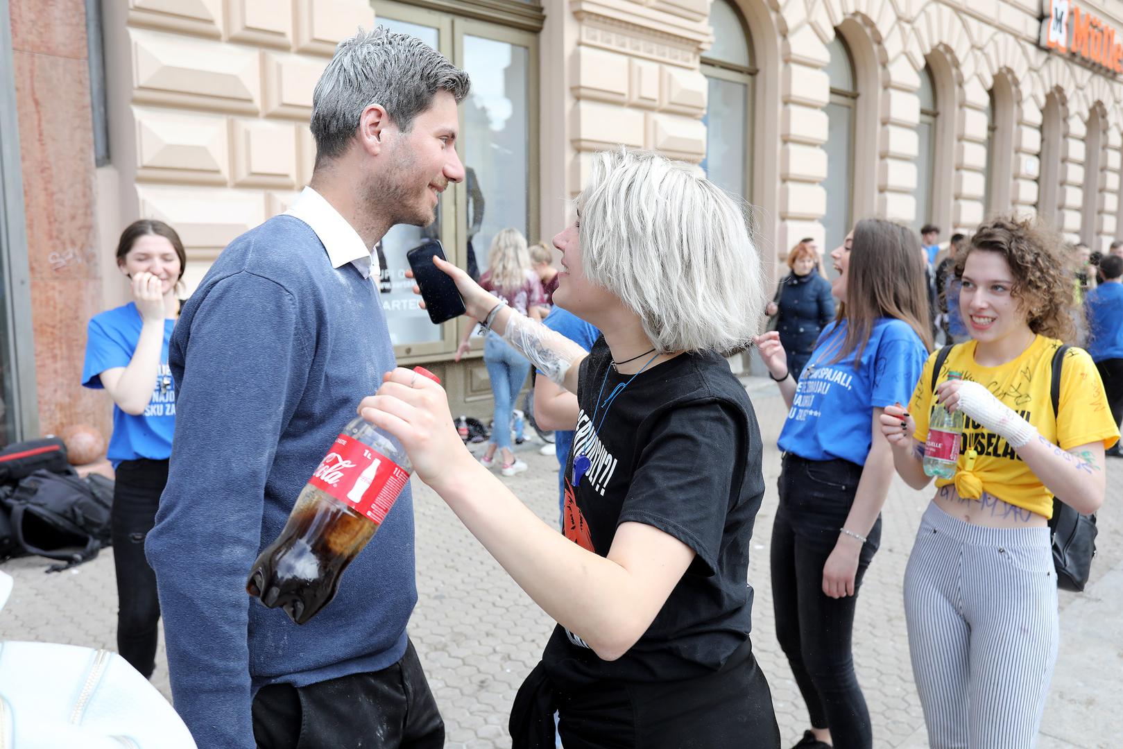12.55 - Maturanti su na Jelačić placu brašnom zasuli zastupnika Živog zida Ivana Pernara:
