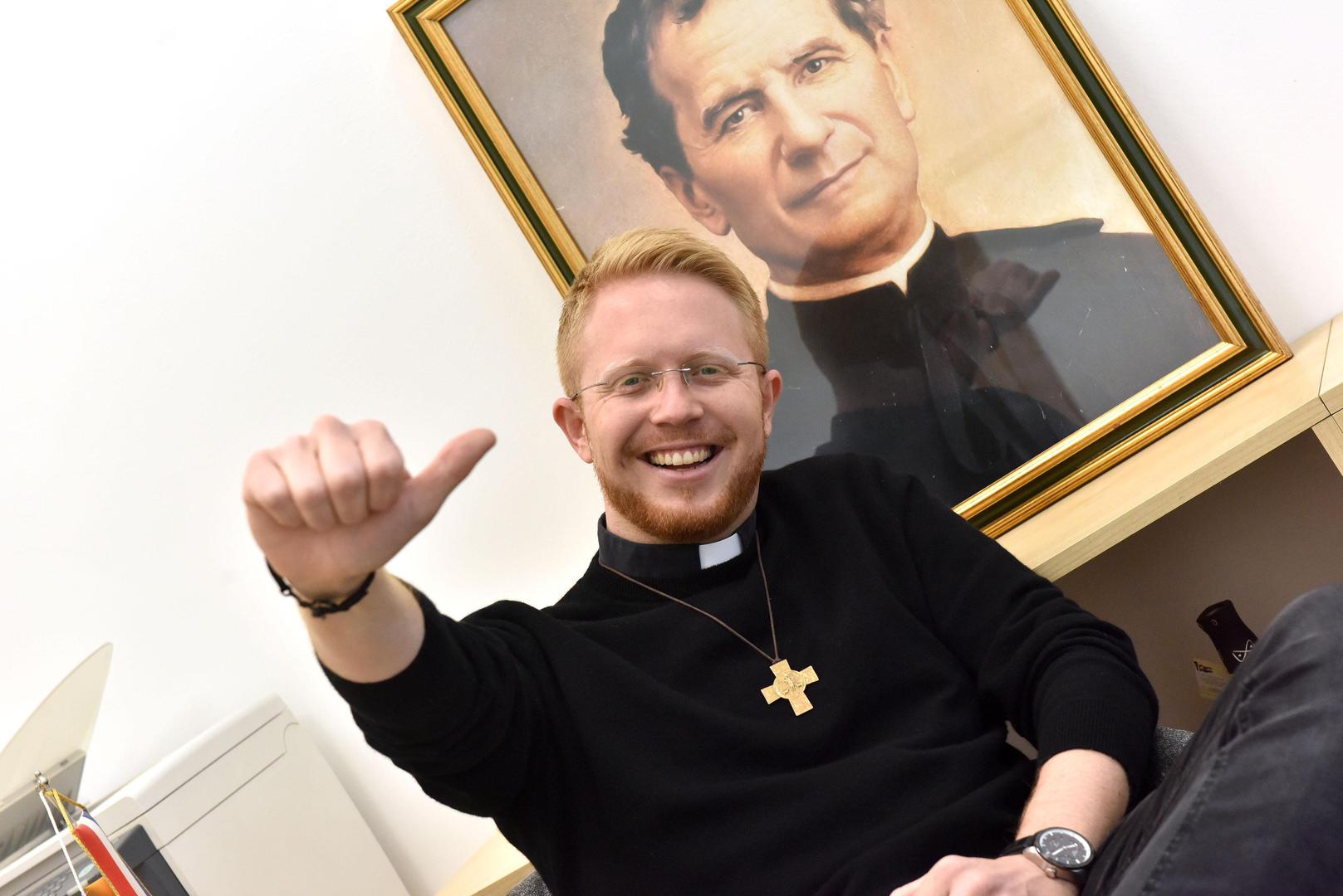 Kad nije u svećeničkoj halji, već u ležernijem izdanju, odnosno u trapericama i sa sunčanim naočalama, 33-godišnji salezijanac iz Pregrade dane provodi u uredu u 12. paviljonu studentskog naselja. Baš kao i njegovim prethodnicima, don Mariju Bobiću i don Damiru Stojiću, koji je kapelan ondje bio 13 godina, studenti mu mogu dolaziti na razgovor, druženje, molitvu...