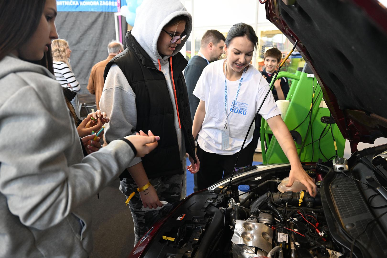 Rijeke osmaša jučer su se slijevale u paviljon, a najveća gužva stvarala se na štandu zagrebačke Elektrostrojarske obrtničke škole gdje buduća autoelektričarka Ruta Sabljić pokazuje dijelove automobila.