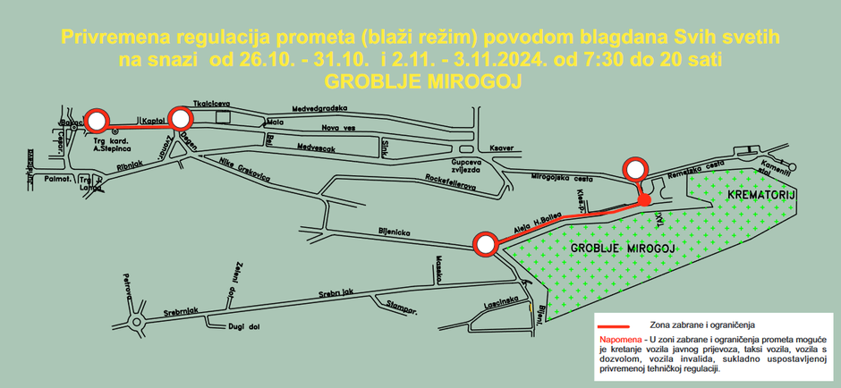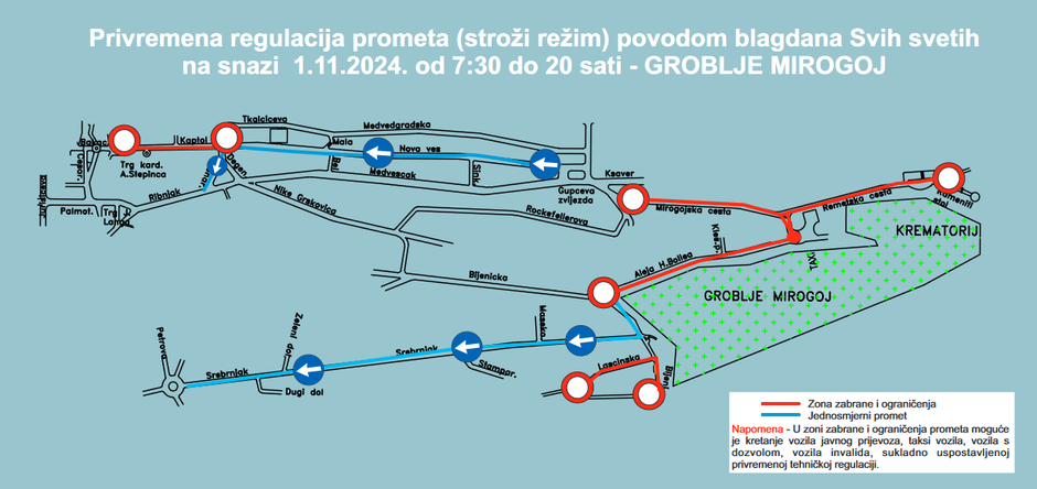 U subotu, 2. studenoga, javni će prijevoz prema većim grobljima biti pojačan dodatnim kapacitetima, a u promet će se, ovisno o potrebama, uključivati dodatni autobusi. Na cestama uz veća groblja primjenjivat će se blaži režim prometnog ograničenja koji obuhvaća zabranu prometa tek na prilaznim cestama Mirogoju, Miroševcu i Markovom polju.
