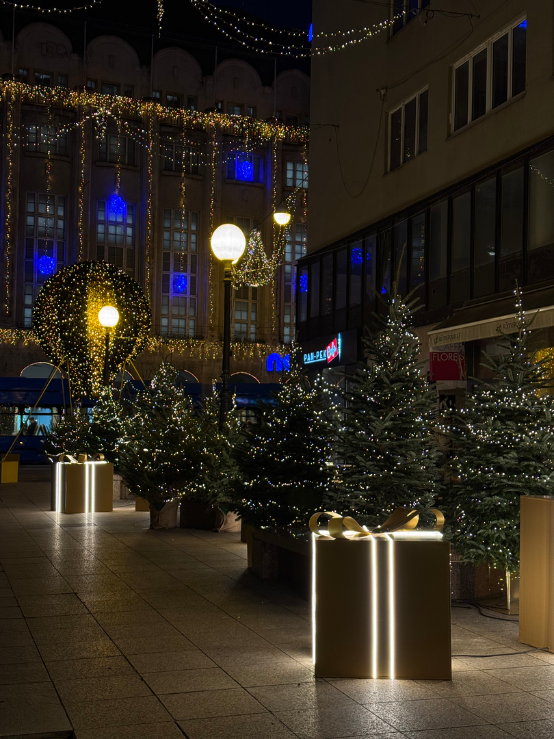 Kada prođete ispod balona, ulica Frane Petrića otvorit će vam prizor koji podsjeća na najljepše blagdanske bajke. Raskošna šuma manjih i većih borova, ukrašenih diskretnim mnoštvom lampica, stvara čaroban dojam šetnje kroz svjetlucavi zimski vrt. Između borova smjestili su se zlatni, predimenzionirani pokloni koji, obasjani rasvjetom, izgledaju kao da su upravo sišli s naslovnica božićnih razglednica. Kada danje svjetlo zamijeni mjesečina i sjaj tisuća lampica, večer poprima gotovo filmski ugođaj i poziva prolaznike da zastanu i uživaju u trenutku.