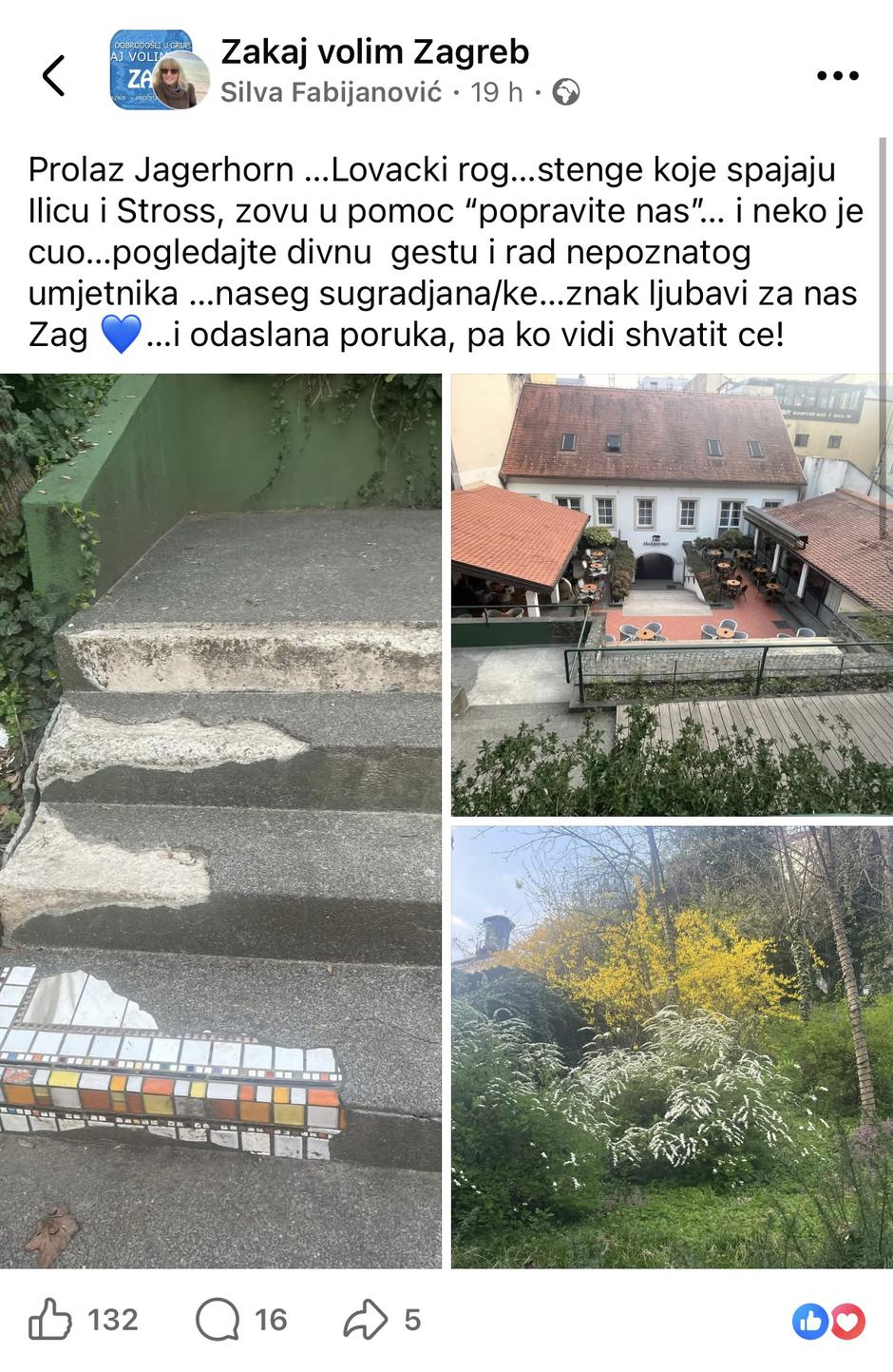 Rane urbanog tkiva, oštećeni pločnici, rupe u asfaltu i pukotine mogu se itekako pretvoriti u umjetnička djela. Pravi primjer toga pokazuje detalj na stepenicama kod prolaza Lovački rog koje spajaju Ilicu i Strossmayerovo šetalište, a čiju je fotografiju objavila jedna Zagrepčanka u Facebook grupi "Zakaj volim Zagreb".
