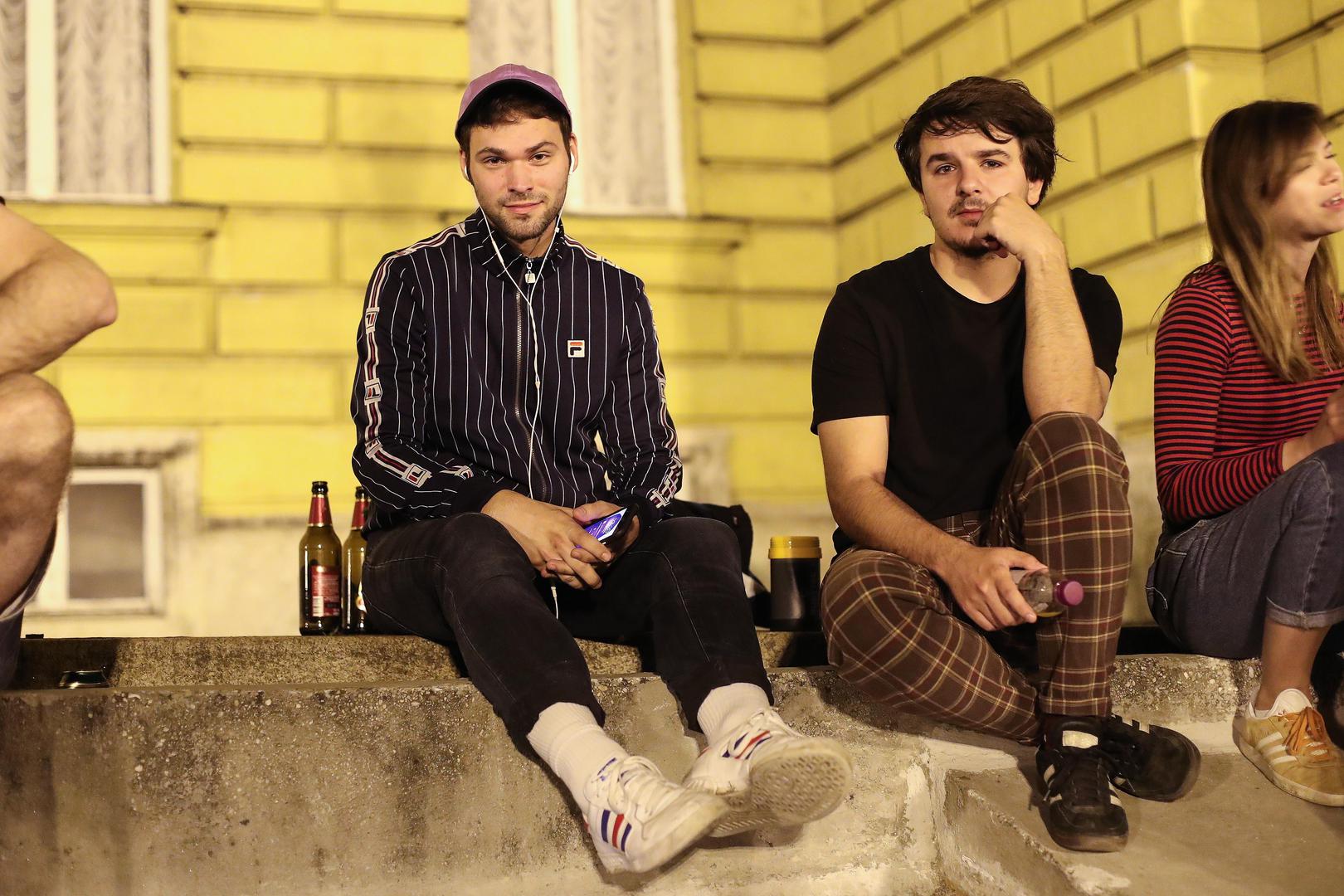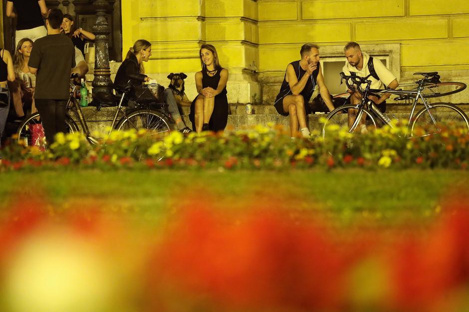 Već oko pola deset najbolje “lože”, odnosno stube i klupice oko neobaroknog zdanja HNK, bile su zauzete. Biciklom, romobilom, skejtom i cipelcugom stizalo je sve više mladih, uglavnom studentarije, u plastičnim vrećicama noseći rekvizite za noćni provod. Oko 23 sata pred HNK se okupilo oko 500 ljudi. Dan prije, još i više. Prostorom su odzvanjali razgovor, smijeh i kakofonija glazbe s prijenosnih zvučnika. Punk, techno, rock i hip-hop spajali su se u žamor tople svibanjske noći koji je poput magneta privlačio prolaznike. Neki od njih zbunjeno su zastajkivali i fotografirali nesvakidašnje sijelo. Drugi su se pridružili mnoštvu, među njima i studentice Tekstilno-tehnološkog fakulteta Petra, Dolores i Jelena.