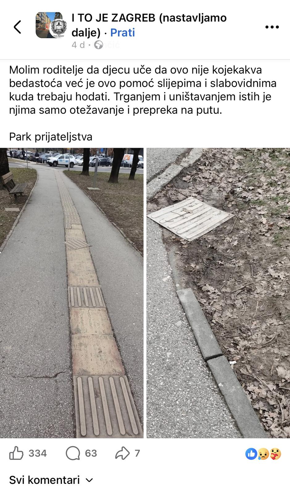 U Facebook grupi "I to je Zagreb" jedan je korisnik objavio sliku koja prikazuje stanje staze za slijepe i slabovidne osobe u Parku mira i prijateljstva, nedaleko samog centra grada. Staza, koja pomaže slijepima kuda trebaju hodati, u vrlo je lošem stanju, izgleda staro, neodržavano, izlizano, ali i opasno jer se netko ondje može lako popiknuti i pasti.