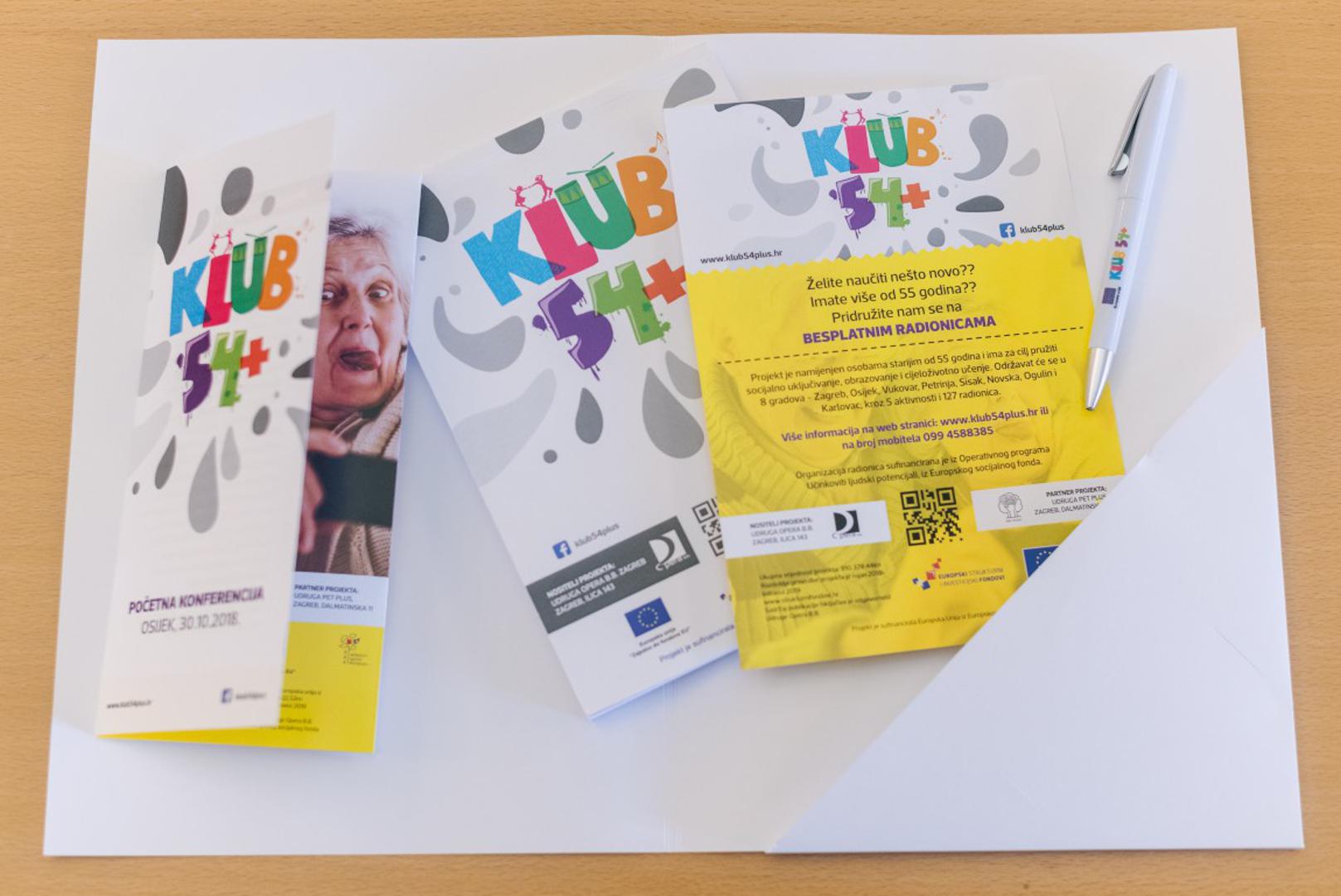 Projekt 'Klub 54 +' sufinanciran je iz Operativnog programa Učinkoviti ljudski potencijali, iz Europskog socijalnog fonda te će se provoditi od rujna 2018. do kolovoza 2019. godine. Kroz sveukupno 127 kreativnih radionica iz 5 vrsta kulturno-umjetničkog stvaralaštva koje će se provesti u Osijeku, Vukovaru, Petrinji, Sisku, Novskoj, Ogulinu, Karlovcu i Zagrebu poboljšat će se kvaliteta života i povećati razina aktivnog sudjelovanja osoba starijih od 55 godina u životu zajednice te se direktno smanjiti socijalna isključenost za minimalno 215 osoba. Kao suradnici na projektu 'Klub 54+' sudjeluju ukupno tri doma za starije osobe i Poetry Caffe koji su ponudili prostor za održavanje radionica. Dom za starije osobe Trnje i Dom za starije osobe Maksimir iz Zagreba te iz Osijeka Dom za starije i nemoćne osobe Osijek i Poetry Caffe Magis.