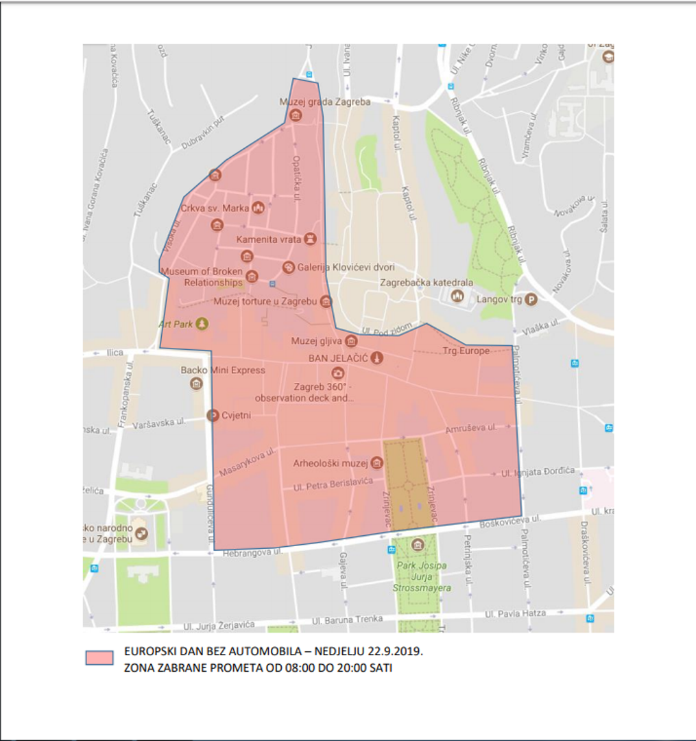 "Preporučamo svim vozačima da na Europski dan bez automobila umjesto svojeg vozila koriste javni gradski prijevoz ili izbjegavaju dolazak vozilom u širi centar grada Zagreba  te isto tako vozačima dostavnih vozila napominjemo da dostavu u centru grada obave do 7 sati. Molimo sve sudionike u prometu da poštuju privremeno postavljenu prometnu signalizaciju te da postupaju u skladu s uputama policijskih službenika i redarske službe", priopćili su iz policije.