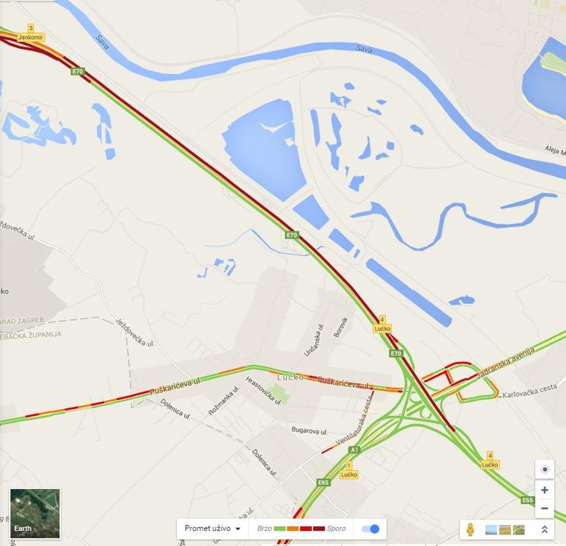 Ovdje možete vidjeti dionice na kojima se promet odvija vrlo sporo (označene crvenom bojom).