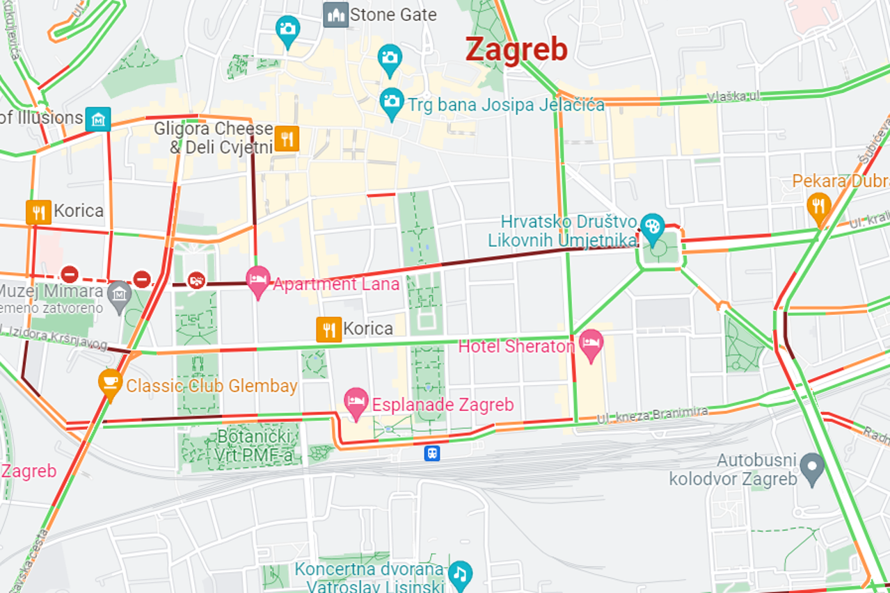 Gužva je nastala od Črnomerca pa sve do Trga Francuske Republike, vidi se na Google kartama