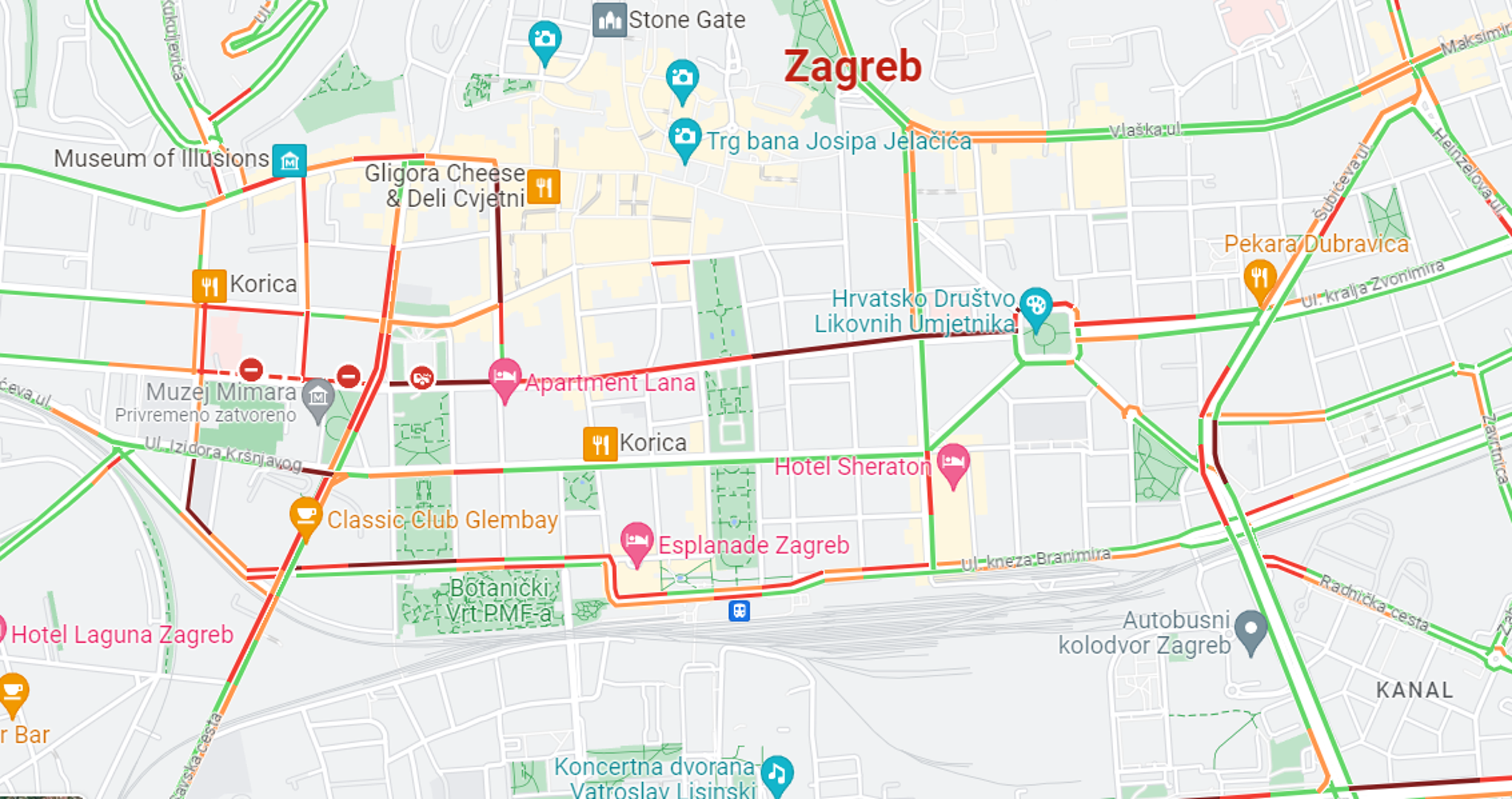 Zbog urušavanja skele i dijela zida Muzeja za umjetnost i obrt u Klaićevoj, u središtu Zagreba nastao je prometni kolaps. Gužva je nastala od Črnomerca pa sve do Trga Francuske Republike, vidi se na Google kartama.