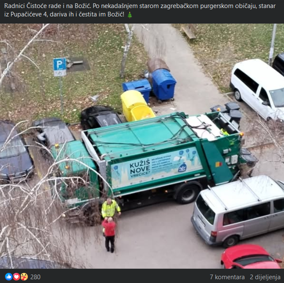 "Radnici Čistoće rade i na Božić. Po nekadašnjem starom zagrebačkom purgerskom običaju, stanar iz Pupačićeve 4, dariva ih i čestita im Božić!" podijelila je jedna od članica kvartovske grupe Zakaj Volim Špansko. Objava je ubrzo naišla na stotine pozitivnih reakcija i pohvala za gospodina koji je svojom gestom uljepšao blagdanske dane ovim ljudima.