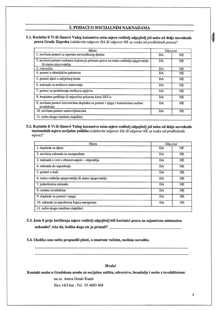 Kako navode u nedjelju u priopćenju, upitnik sadrži 33 pitanja o općim podacima, obiteljskom i stambenom statusu, zaposlenju, prihodima i socijalnim naknadama, a svaki sadrži svoj broj pa upitnici nisu anonimni, kako se navodi u njihovom uvodu. Svaki korisnik dobio je svoj kod kako bi, ističu, u Gradskom uredu samo dopunili svoju bazu podataka.