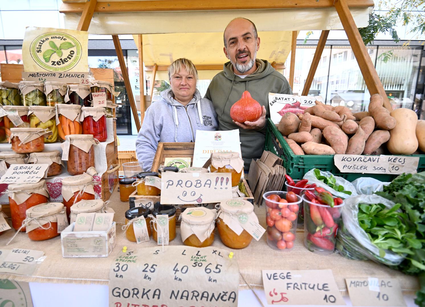 Možete se opskrbiti i povrćem iz ekološkog uzgoja s OPG-a "Slatko moje zeleno" iz Donje Stubice, koje su donijeli supružnici Anita i Zvonko Hursa. Nude sezonsko povrće poput batata, kojemu je cijena 20 kuna, glavica kovrčavog kelja stoji upola manje, a cijena tikvi je 15 kuna po kilogramu. Rade, dakako, i zimnicu, čija je sajamska cijena 35 kuna za staklenku, a možete kušati i njihov džem od gorke naranče koji stoji od 30 do 65 kuna.