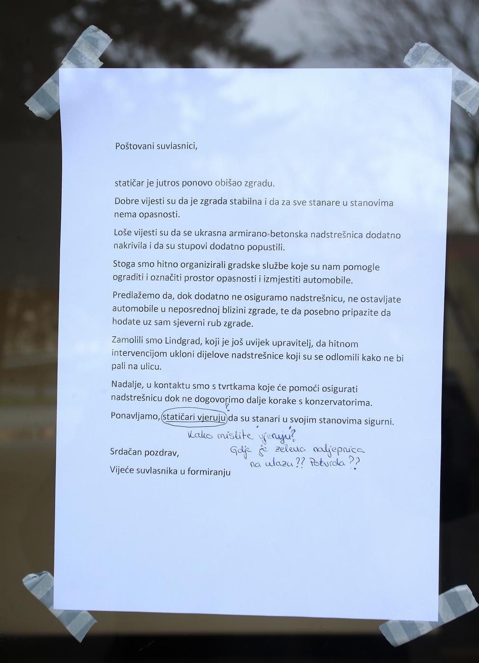 O cijeloj situaciji oglasio se jučer i zagrebački gradonačelnik Milan Bandić, koji je rekao da se nadstrešnica mora ukloniti, i to pod hitno, no nije propustio napomenuti i da se radi o zgradi u privatnom vlasništvu te da su stanovnici uklanjanje već trebali sami početi rješavati. A ne učine li to oni, i to što prije, stvar će u svoje ruke preuzeti Grad.