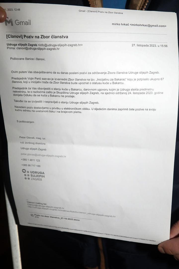 – Nemar je već pokazan otkako je u lipnju 2022. novo vodstvo preuzelo upravljanje udrugom. Prije toga, jedan mještanin Bakarca redovito je obilazio kuću izvan sezone, no prošle zime on nije angažiran – navodi Mirko Hrkač, danas bivši član Udruge slijepih. Otkako je doznao o čemu se razgovaralo 17. travnja, Hrkač postavlja pitanja u vezi s Bakarcem, a vodstvu udruge predložio je i donaciju od 6000 eura za sanaciju, no ona nije prihvaćena.