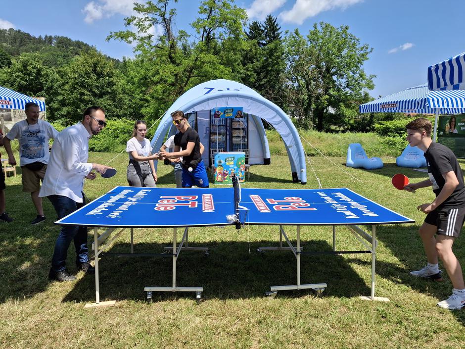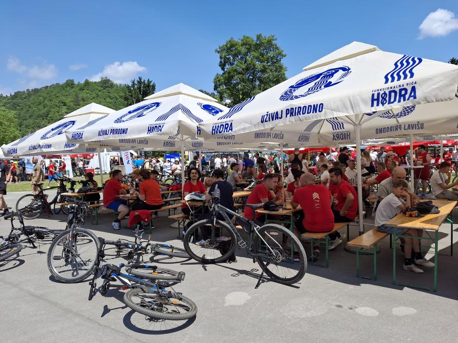 Zabava je počela! Minea zapjevala na pozornici11:50 - Po dolasku na cilj dio sudionika opušta se u hladovini, ispod krošnji drveća te ispod suncobrana. Slatke delicije, krafne za koje se pobrinuo Di-go, planule su u trenu, a dugi redovi stvaraju se i na punktovima s mesnim specijalitetima. Uz osvježavajuća pića publika s nestrpljenjem očekuje nastup Minee. Nakon njezinog nastupa, s početkom od 13:30, na repertoaru su i pub-kviz, "wine&paint" radionica te ona pod nazivom "Prometna abeceda" za najmlađe.