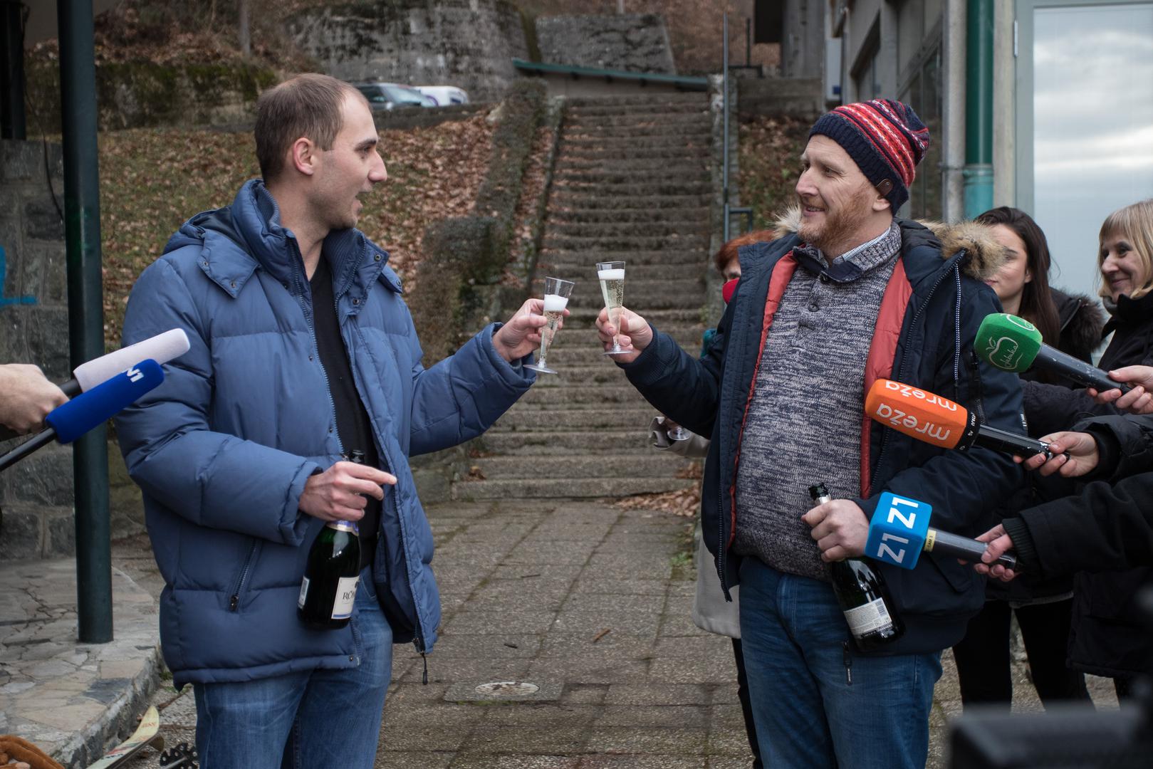 Matej Mišić (SDP) i Renato Petek (NH-PS), zastupnici zagrebačke Gradske skupštine, otvorili su uz šampanjac novu žičaru na Sljemenu.