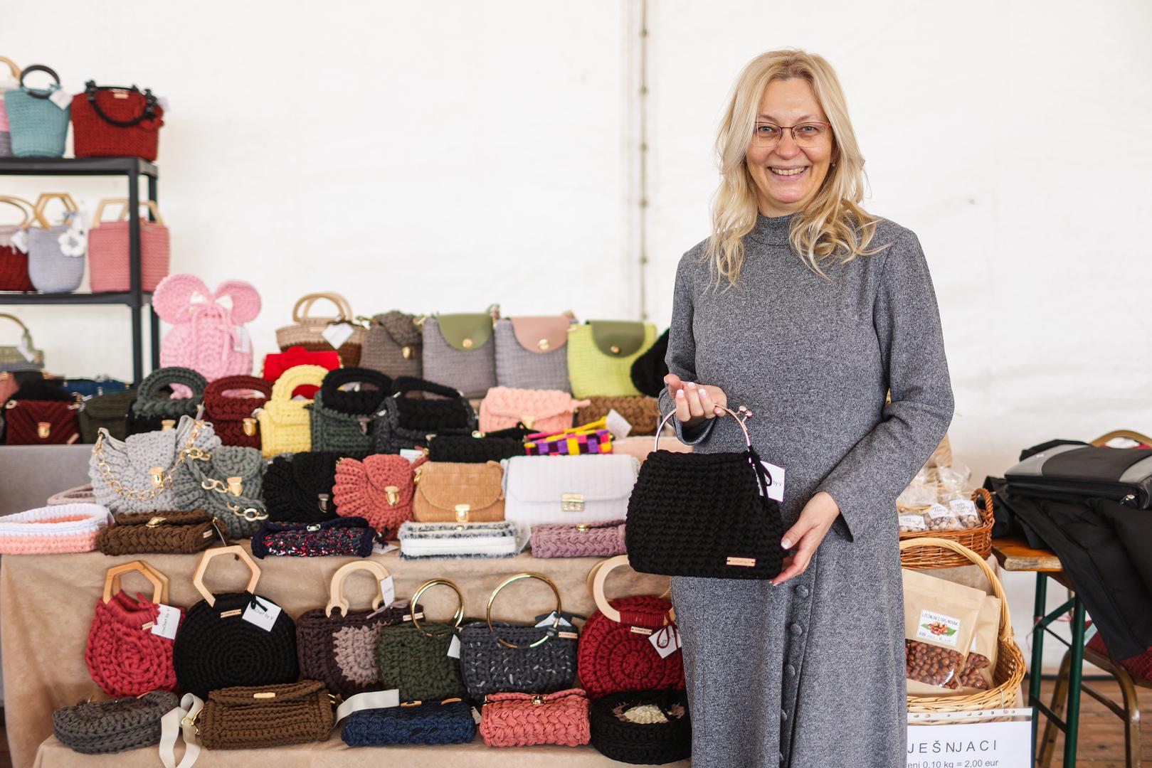 Šarenilo jarkih boja privući će vas pak na štand Višnjice Novak iz Čazme, koja se predstavlja ručno rađenim torbicama od recikliranog pamuka. Svaka je, kaže, unikatna jer izrađuje ih od ostataka pamuka koji ostanu nakon šivanja, a za jednu joj treba četiri do šest sati. Cijena im se kreće od 35 do 45 eura, a radi ih i prema željama klijentica koje u tom slučaju same biraju boje, tip remena, veličinu kopče.