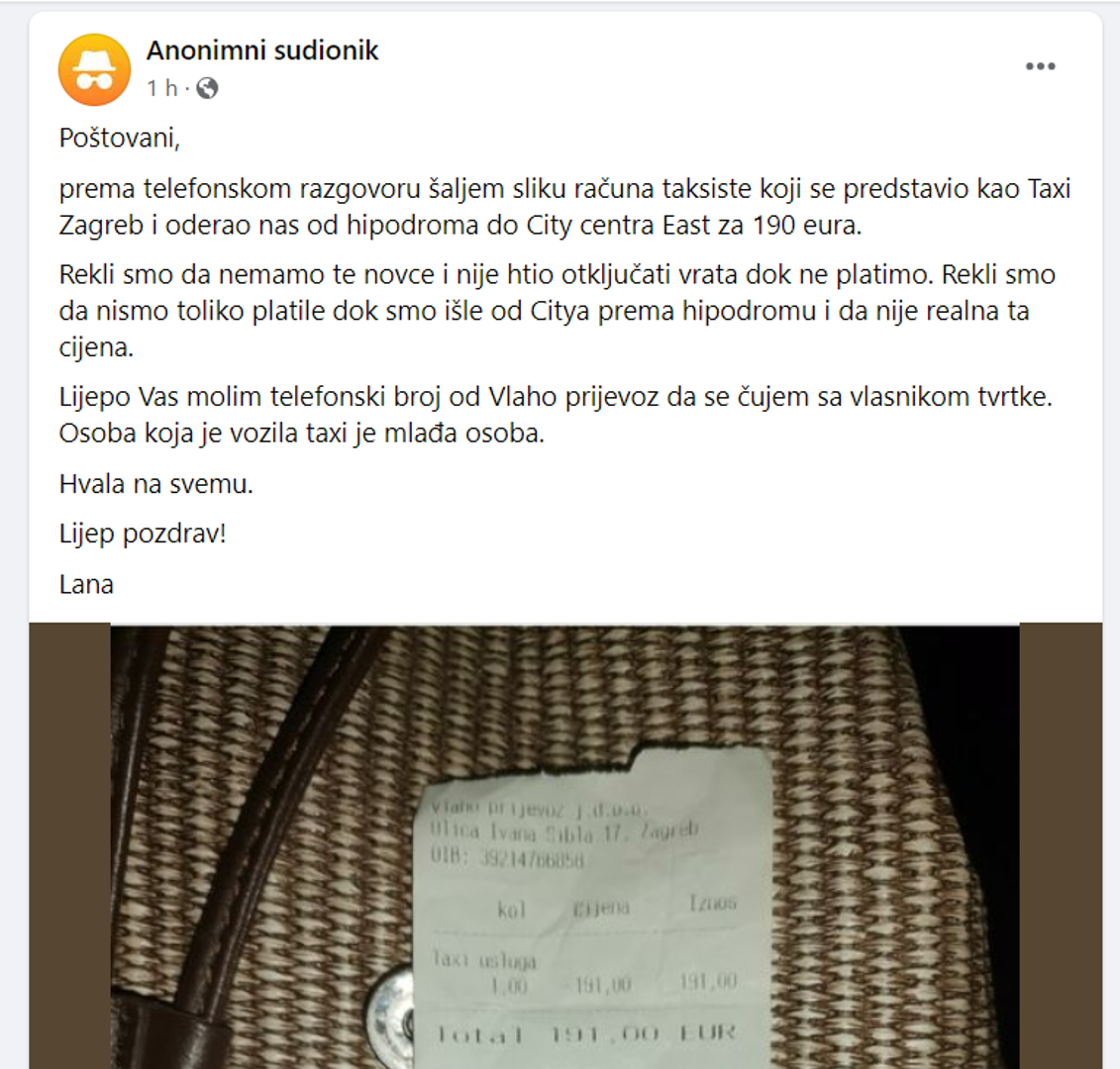 "Rekli smo mu da nemamo taj novac i nije htio otključati vrata dok ne platimo. Rekle smo da nismo toliko platile dok smo išle od Cityja prema hipodromu i da ta cijena nije realna" napisala je, no nije otkrila kako se situacija razriješila. U Facebook grupi za taksiste i njihove putnike zamolila je da joj netko da telefonski broj tvrtke Vlaho prijevoz kako bi razgovarala s vlasnikom, a navela je i da je taksist o kojem je riječ bio mlad.