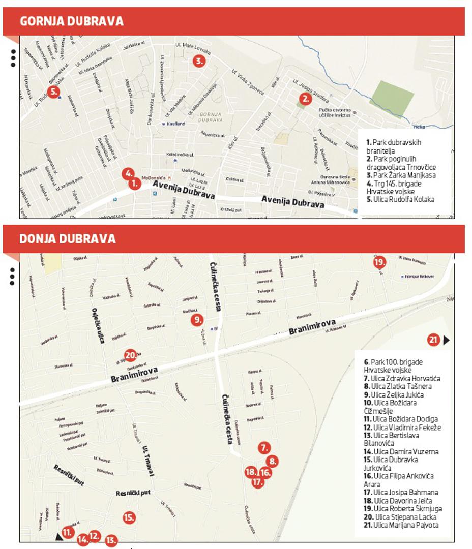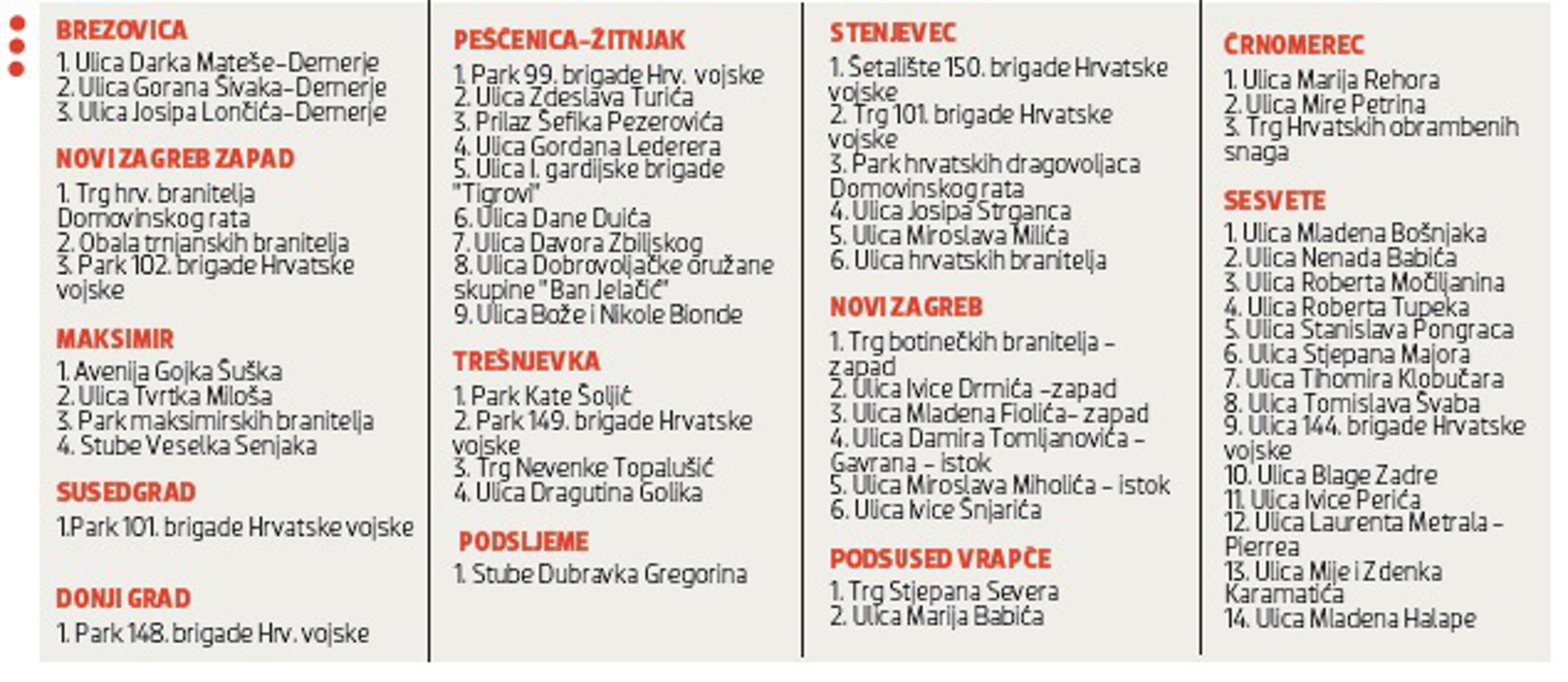 U Brezovici, na Črnomercu i u istočnom Novom Zagrebu po tri su javne površine posvećene hrvatskim vitezovima, baš kao i u Maksimiru. Na Trešnjevci ih je ukupno četiri, u zapadnom dijelu Novog Zagreba petero, u Stenjevcu sedmero, a iza njih je četvrt Peščenica – Žitnjak s njih devet te Sesvete s čak 14 ulica, trgova i parkova. Titulu “braniteljskog” kvarta odnijela je Dubrava, gdje je 21 javna površina nazvana po sudionicima Domovinskog rata, od čega je šestero junaka trg ili ulicu dobilo u Gornjoj, a 15 u Donjoj Dubravi.
