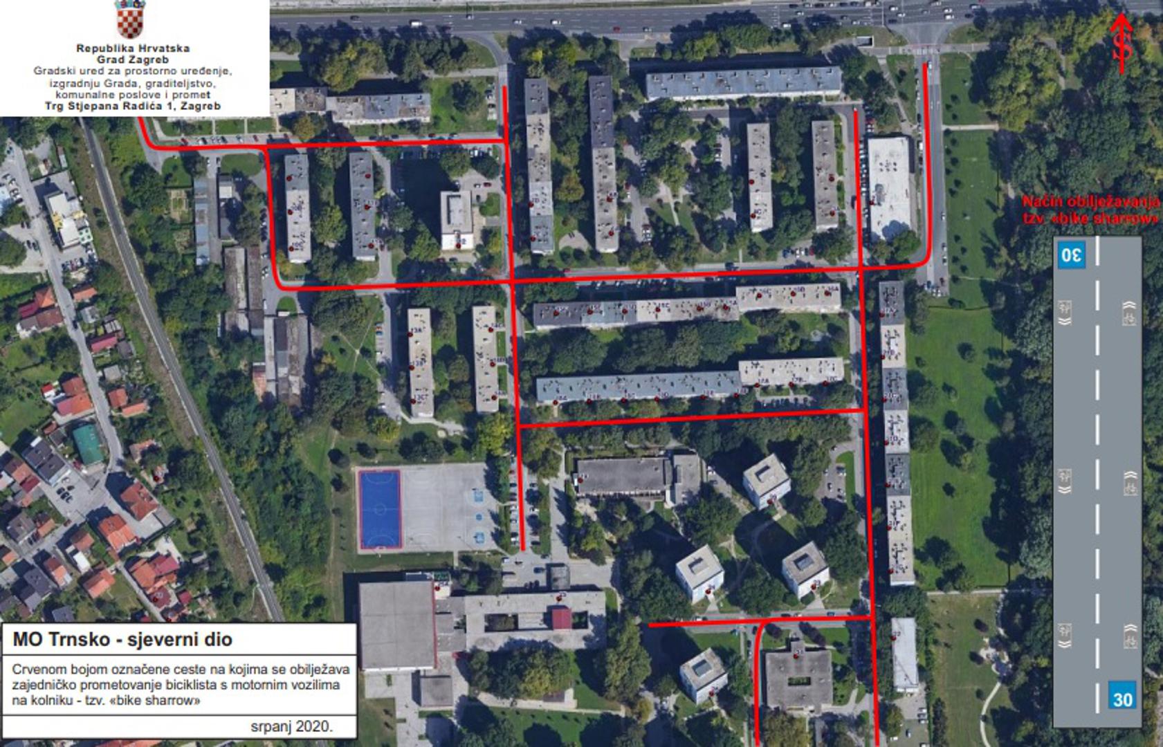 Novost je i ta da će se u cijelom Trnskom dodati tzv. “bike sharrow” oznake, koje upozoravaju da se na cesti nalaze i biciklisti te da se zato motornim vozilima preporučuje vožnja do 30 kilometara na sat.