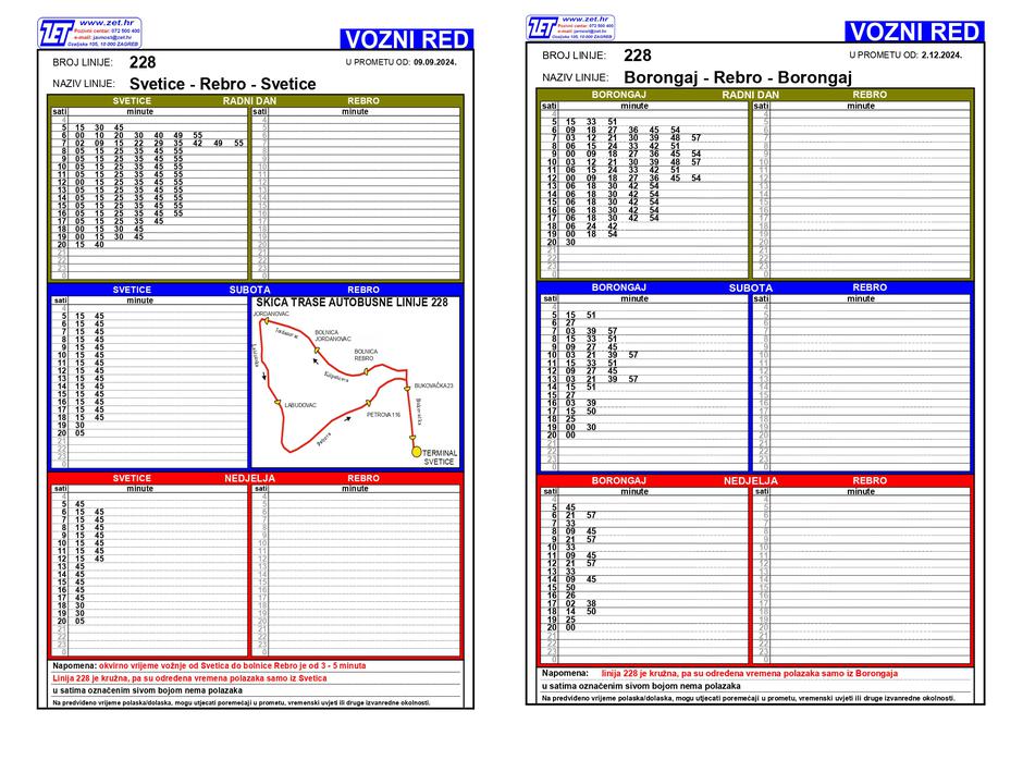 Za svaku dodatnu osobu u automobilu plaća se još jedan euro više na osnovnu kartu od 2.3 eura. Autobusna linija 228 od ponedjeljka ima i novi vozni red, a vozit će svakog dana od 5 ujutro do 20.30 sati, a slijed polazaka u prometnim špicama bit će svakih 9-12 minuta, no Park and Ride bit će dostupan radnim danom od 7 do 20 sati. Autobus će polaziti s prvog perona na Borongaju. Kako ne bi zaglavio u gužvu na Bukovačkoj putem do Rebra, autobus će voziti prvom fizički odvojenim žutim trakom kojim će osim ZET-a moći prolaziti samo hitna i taxi pa bi poveznica do bolnice trebala biti neopterećena gužvama.