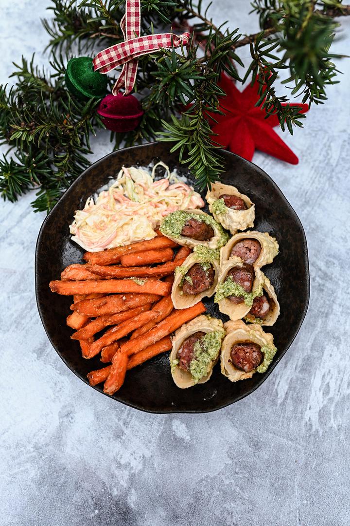 Kako se u Alpama jede prava zimska hrana za okrijepu, tako ćete i na Baš Naš Alpskoj kućici kušati razne varijacije i street food kombinacije kobasica i hrenovki od raznih vrsta mesa. Jelo Ko konj, zapravo je konjska kobasica sa zapečenim grahom, kukuruzom, salatom i toplim brioche pecivom. Na ovoj kučici možete probati i Vege – san, vegetarijansku opciju kobasice s humusom, ketchupom od cikle, salaticom i pecivom. Osim slanih delicija, očekuju vas i slatke germknedle s punjenjem od šljive i čokolade te raznim umacima i posipima.