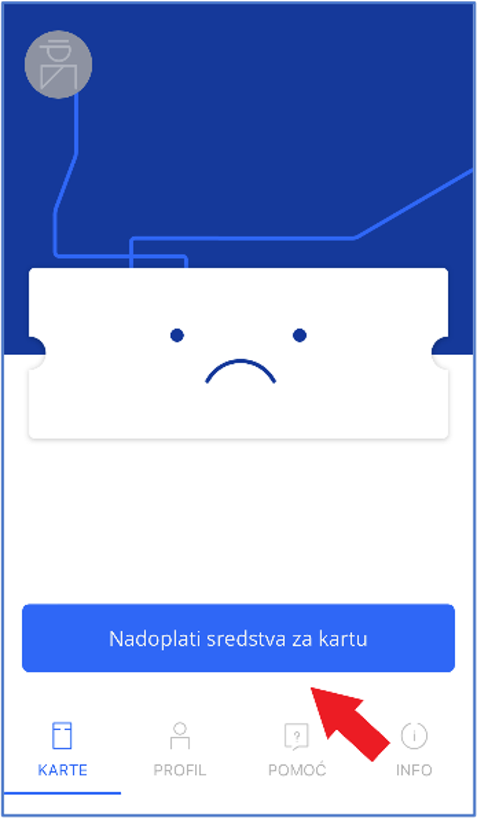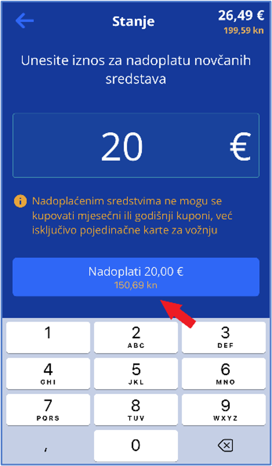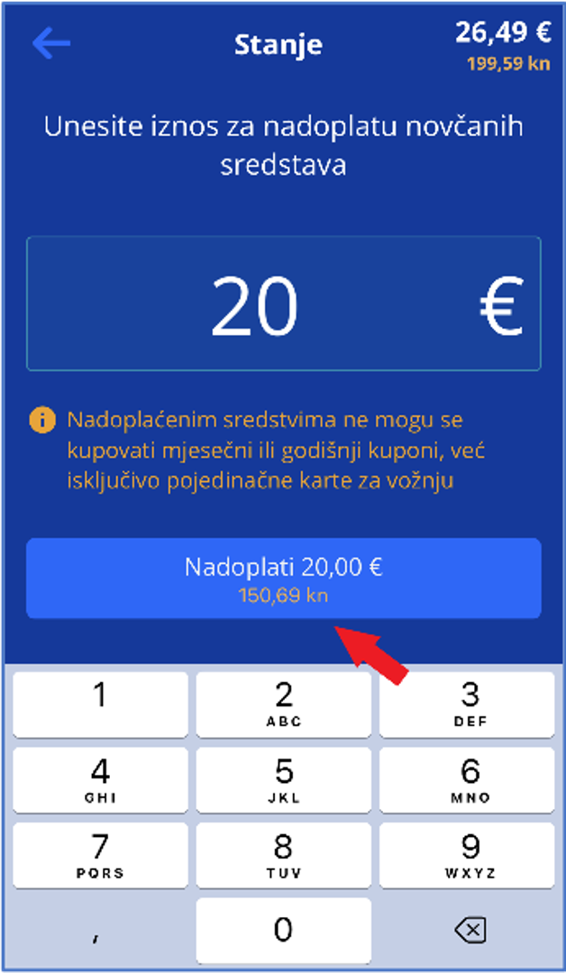 Za kupnju pojedinačne karte u vozilu potrebno je prethodno nadoplatiti sredstva eNovčanika. Za prvu nadoplatu odaberite „Nadoplati sredstva za kartu“. Unesite iznos koji želite nadoplatiti. Moguća je nadoplata od najmanje 1 €. Najviši iznos koji možete imati na računu jest 50 €.