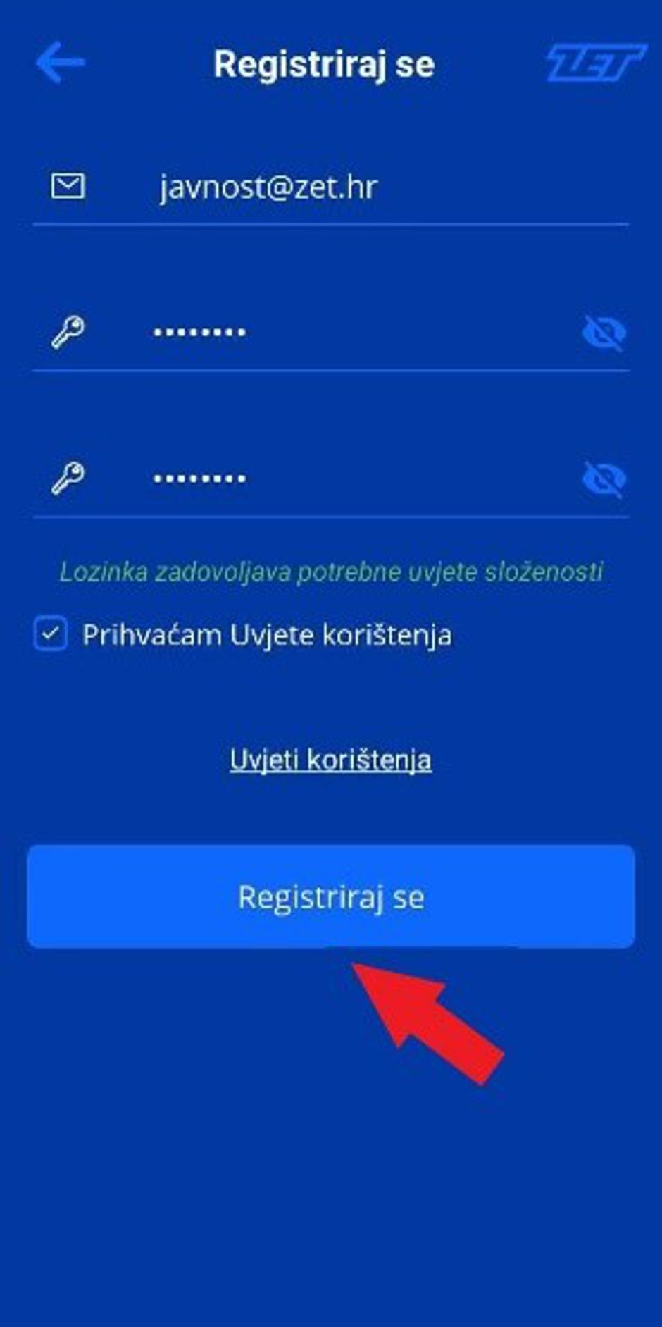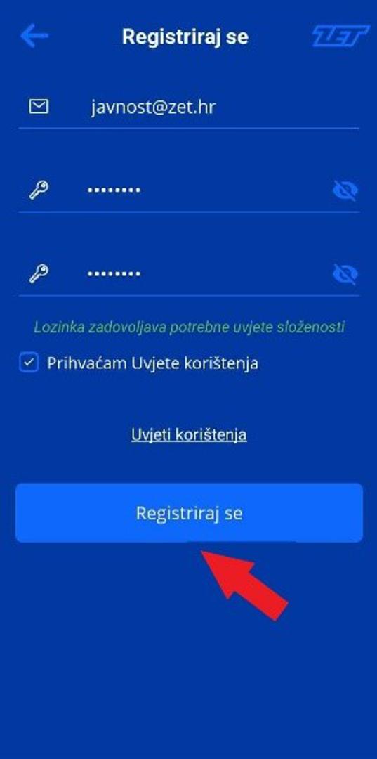 Na početnom zaslonu odaberite „Registriraj se“, unesite podatke za registraciju: adresu e-pošte i lozinku te prihvatite Uvjete korištenja.